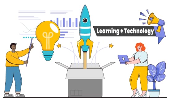 A person sitting in a chair uses a tablet. They are surrounded by computer windows containing books, a smiley face, and a megaphone.