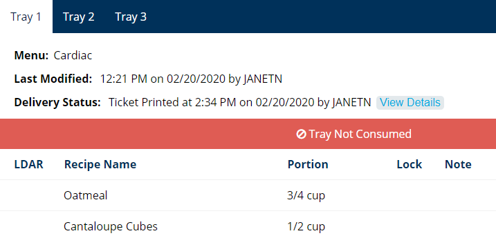 If a patron did not consume a tray and you do not want the nutrients and exchanges from that meal to be included in the totals on the patron's Meal Nutrients & Exchanges and Daily Total Nutrients tabs, you can mark the lack of intake on the patron's tray history.