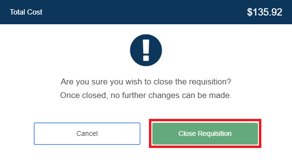 Caution: Any items in a requisition with a quantity of zero (0) will be automatically deleted during the close process. Be sure that all information is accurate before closing the requisition.