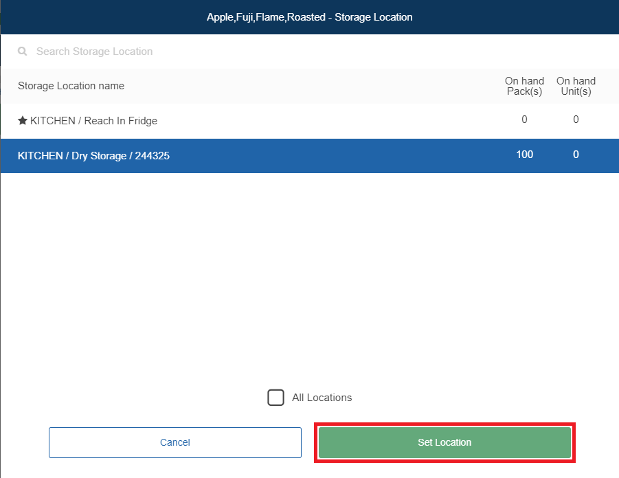- Click Set Location. The Item Name - Storage Location dialog appears.