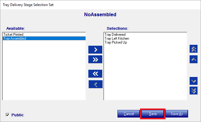 Once you have inactivated specific tray delivery stages, you can use Hospitality Suite to create a selection set that excludes inactive delivery stages. You can then use this selection set for a widget to ensure that the widget only displays the active stages.