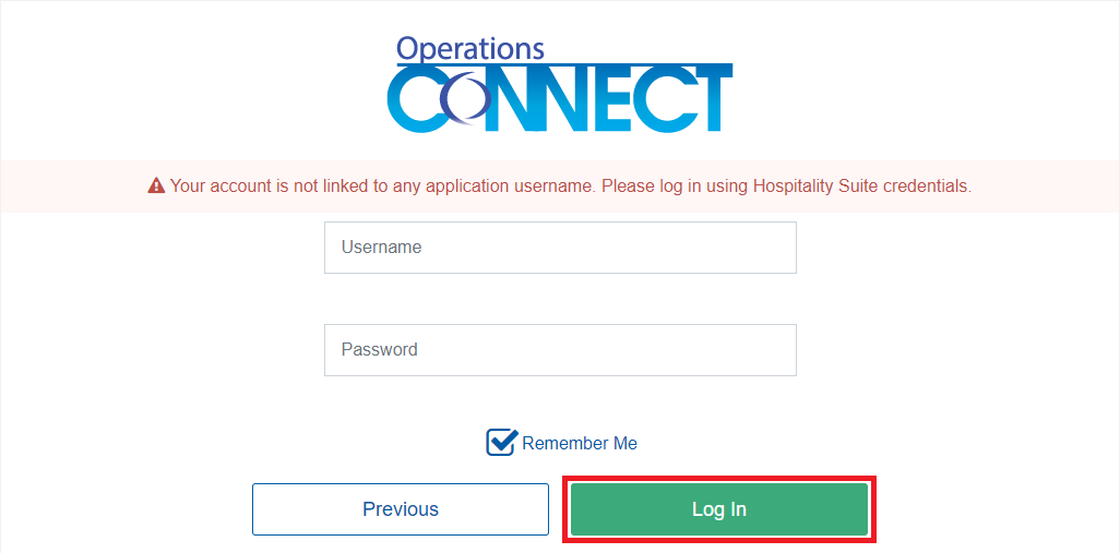 - If you attempt to log in to Operations Connect, but have an incompatible version of Hospitality Suite, an error message displays below the Operations Connect logo.